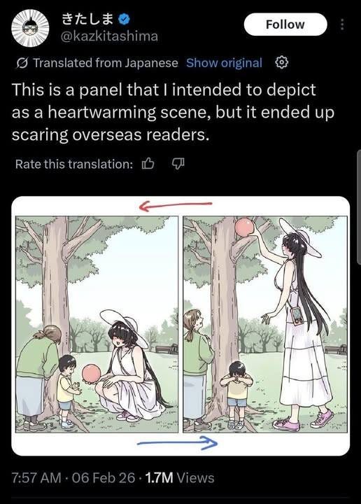 This is a funny little social media post I saw recently and enjoyed. In Japan, comics are read right to left, while obvs in the US we read them left to right. So this heartwarming Japanese comic about a very tall woman became a story of terror when read backwards by people elsewhere.