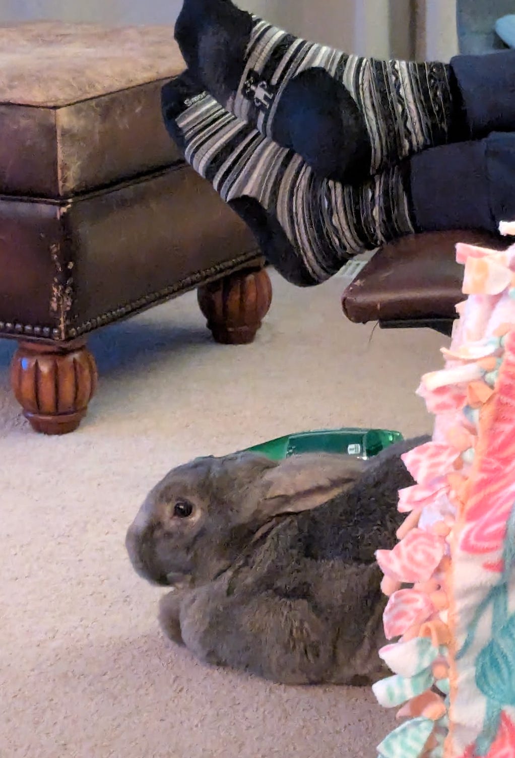 Bruce likes to stick close to my wife in the evenings when he comes in. Here he is taking a rest under her feet. Yesterday morning when he came inside he was eating, and when he heard her come into the kitchen he started running in circles until she came over to say good morning and give him a head scratch.