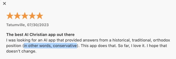 By which I only mean, the app will not be Jesus. It’s interactive media with a point of view. Its creators have a point of view, a bias, as well. Which means that not only are you *not* “texting with Jesus” you’re actually texting with someone else’s idea of who Jesus is. Around here we might say, you’re texting with someone else’s “Imaginary Jesus.”SO INTERESTING. “I was shopping for a Jesus who matched my own preferences. I’m glad to say that in this app I found it!” The review above is interesting, where the reviewer assures us that the Jesus in this app is “conservative.” So if there’s a market for this app, couldn’t there be a market for other apps? Chat with Secular Jesus3, for instance. Chat with Progressive Jesus. Muslims will have Chat with Isa. Mormons will need a Jesus a little different than the Evangelicals, and Evangelicals will need one a little different than the Catholics.