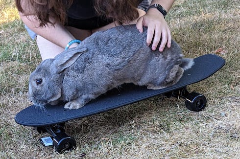 Here’s Bruce checking out Myca’s new skateboard. Zoey is in there, making sure he’s safe since we didn’t have a rabbit-sized helmet on hand.